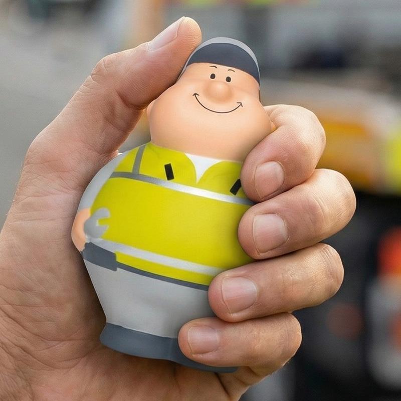 Bert®, l’assistant routier anti-stress de MBW®, est un objet promotionnel conçu pour soulager la pression tout en rappelant l’importance de la sécurité. Habillé d’un gilet jaune fluo avec bandes réfléchissantes, d’un ensemble gris et d’une casquette assortie, il arbore un look professionnel. Dans chaque main, une clé et un tournevis soulignent son rôle d’agent d’intervention.