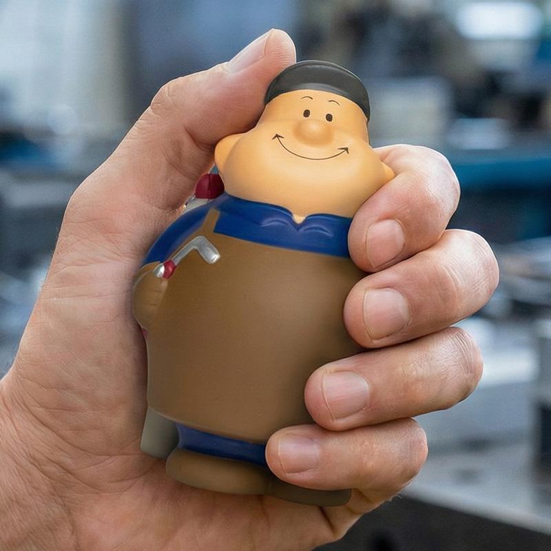 Le soudeur Antistress Bert® de MBW® est un objet promotionnel unique qui met en avant l’univers du travail et de la précision. Vêtu d’une combinaison bleue avec un tablier, des chaussures et des gants de protection marron, il arbore un masque de soudure relevé sur le front. À ses côtés, un réservoir d’acétylène souligne son environnement professionnel, tandis qu’il tient un dispositif de démarrage en main.
