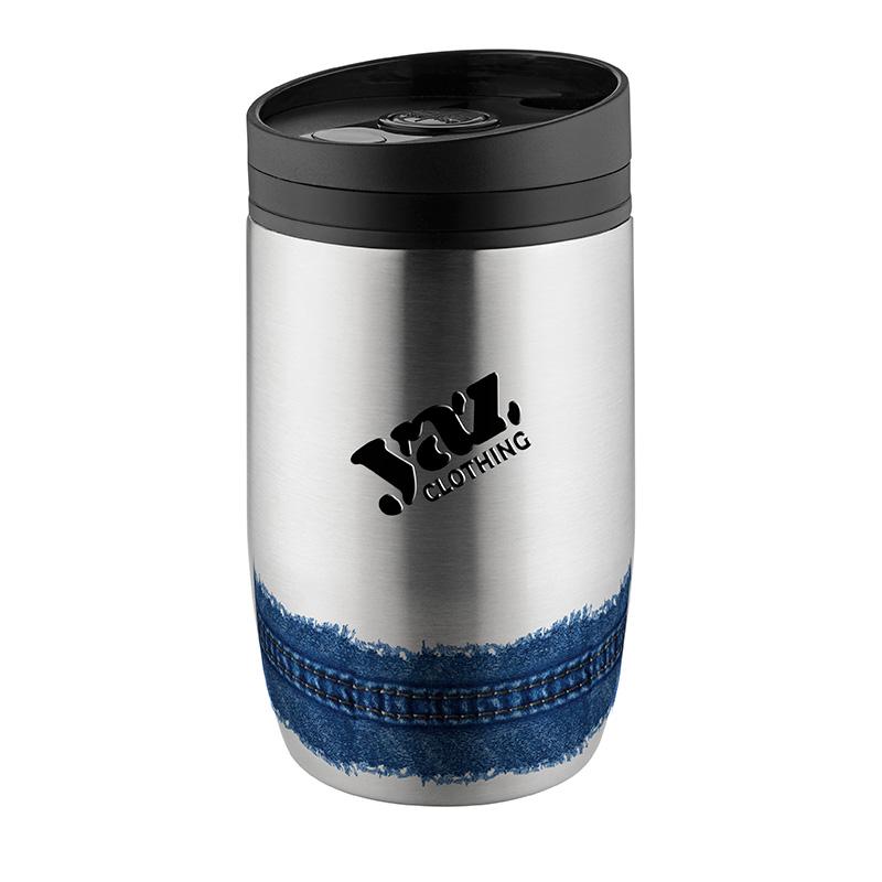 Mug isotherme en acier recyclé, étanche et personnalisable.