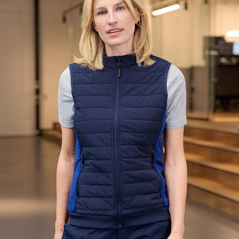 Daiber® vous propose un bodywarmer de travail matelassé pour femme, stylé et fonctionnel, fabriqué à partir de 95% polyester et 5% élasthanne, ainsi que 90% polyamide et 10% élasthanne pour une coupe confortable et légèrement cintrée. Doté d'un matelassage Sorona® AURA, composé de fibres renouvelables, ce bodywarmer garantit respirabilité, légèreté et conservation de la chaleur.