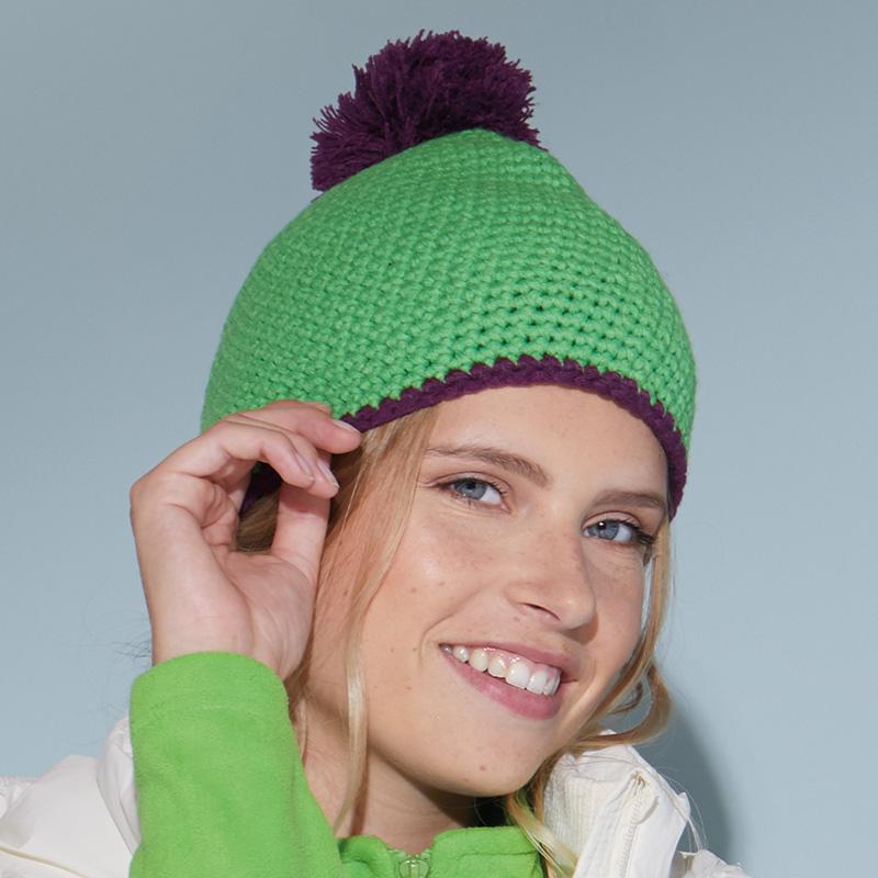 On aime Bonnet crocheté avec pompon et bande contrastés, certifié OEKO-TEX®, personnalisable.