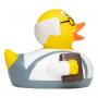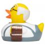 Le canard jaune couinant "Grand-père lecteur" MBW® représente un grand-père chauve avec des cheveux blancs et des lunettes, vêtu d’un pantalon gris à bretelles et d’un t-shirt blanc. Sous ses ailes, il tient un livre et un plaid rayé marron et blanc. Fabriqué en PVC, il mesure 8 x 8 x 7 cm pour un poids de 43 g.