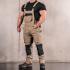 La salopette comprend une grande poche centrale à soufflet avec rabat, une ouverture pour genouillères, trois poches avant (dont une zippée), deux poches arrière (dont une avec rabat et bouton), et deux poches multifonctionnelles sur les cuisses. La taille élastiquée avec passants pour ceinture et la fermeture zippée assurent un confort pratique.