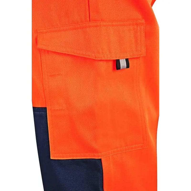 Dotée d’une grande poche centrale avec rabat et poche crayon, de deux poches avant plaquées et de deux poches arrière à rabat, elle permet un rangement pratique des outils et accessoires. La fermeture boutonnée sur les côtés facilite l’habillage, tandis que les bandes réfléchissantes segmentées 3M de 7 cm améliorent la visibilité.