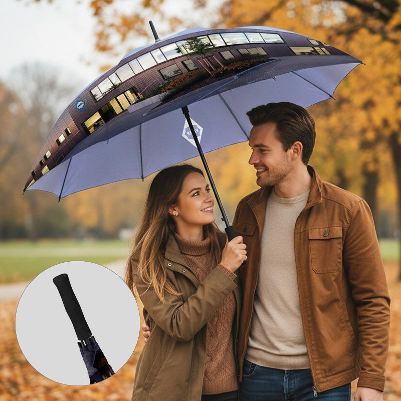 Parapluie sur mesure avec toile à sublimer et résistance au vent.