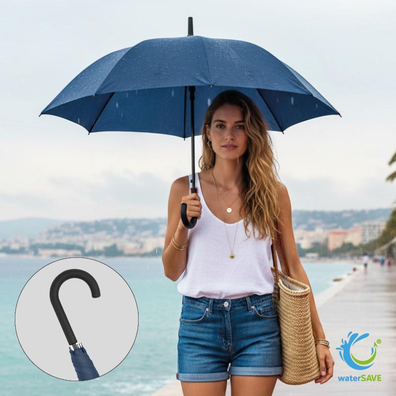 Le parapluie standard FARE® se distingue par sa technologie waterSAVE®, qui permet une réduction significative de l’eau et de l’énergie lors de la fabrication de sa toile 100 % PET recyclé pongé certifiée OEKO-TEX.