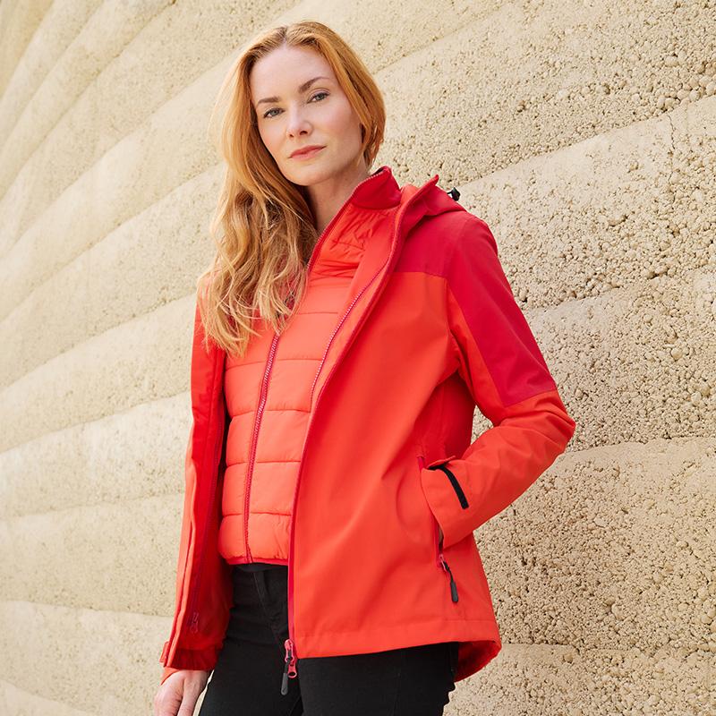 Veste 3 en 1 RPET femme Daiber® conçue pour s’adapter aux conditions climatiques changeantes grâce à sa construction modulable. La veste extérieure, dotée de coutures étanches, d’une fermeture zippée étanche double sens avec rabat intérieur et d’une capuche ajustable, assure une protection fiable contre le vent et l’humidité. Sa coupe légèrement cintrée et ses finitions bicolores apportent une silhouette soignée.
