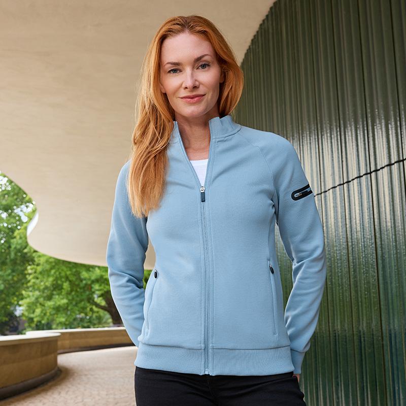 Veste interlock bio & RPET femme Daiber® au design épuré et à la finition soignée. Confectionnée en tissu interlock dense de 360 g/m², elle associe coton bio ringspun, polyester recyclé et élasthanne pour un confort agréable, une bonne tenue et une élasticité maîtrisée. Sa coupe légèrement cintrée valorise la silhouette tout en restant confortable pour un usage quotidien.