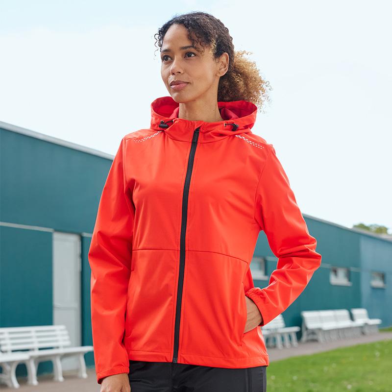 Veste softshell RPET légère femme Daiber®, conçue pour les activités extérieures par temps variable. Le col montant avec protège-menton, la capuche ajustable par cordon élastique et la coupe légèrement cintrée assurent une protection confortable tout en préservant la liberté de mouvement. Les impressions réfléchissantes au dos et à l’avant sur les épaules améliorent la visibilité.